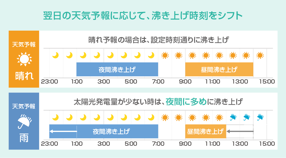 「昼間シフト天気予報連動」機能はエコキュートがダイキンサーバーと通信し、翌日の天気予報が晴れ予報なら、湯沸かしを昼間にシフトするという機能です。