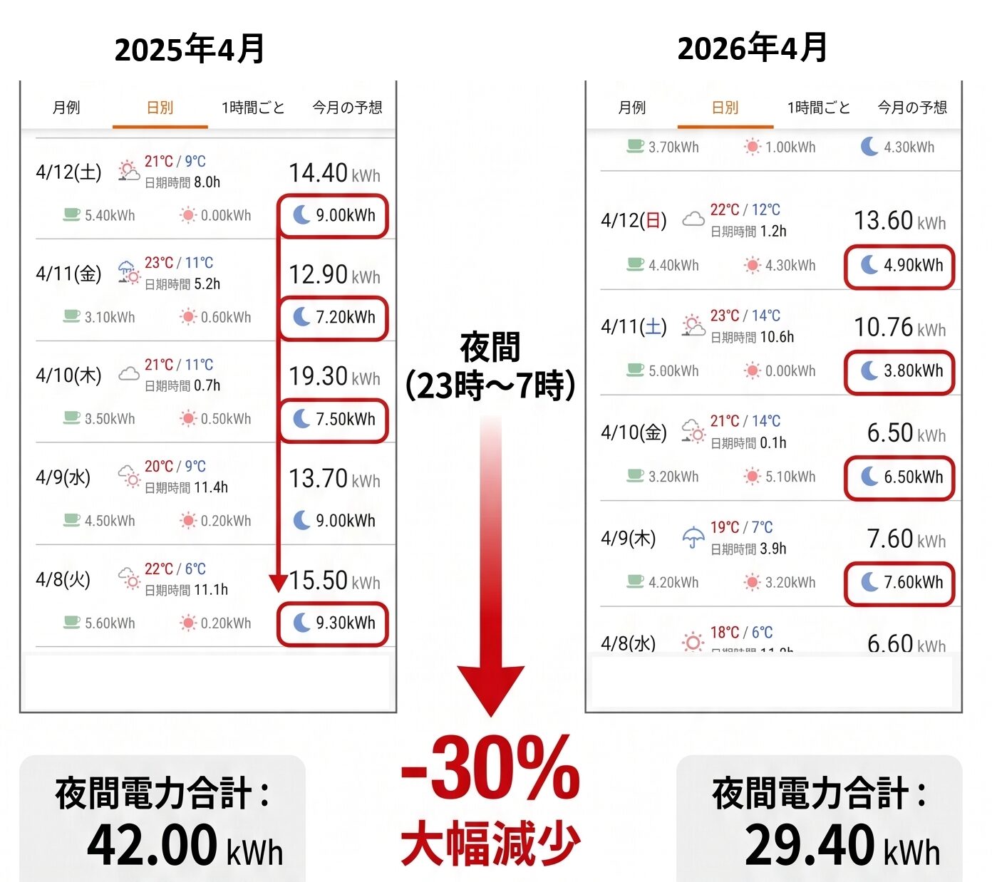 エコキュートの学習期間も終了し、実際の電気使用量が分かってきましたので、2025年4月と2026年4月を比較して、どう変化したのか確認しました。