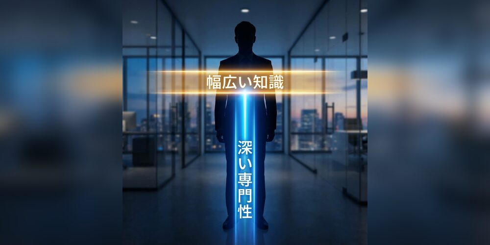 アルファベットの「T」の形のように、「一つの深い専門性(縦軸)」と「幅広い周辺知識(横軸)」を併せ持つ人材のことです。
