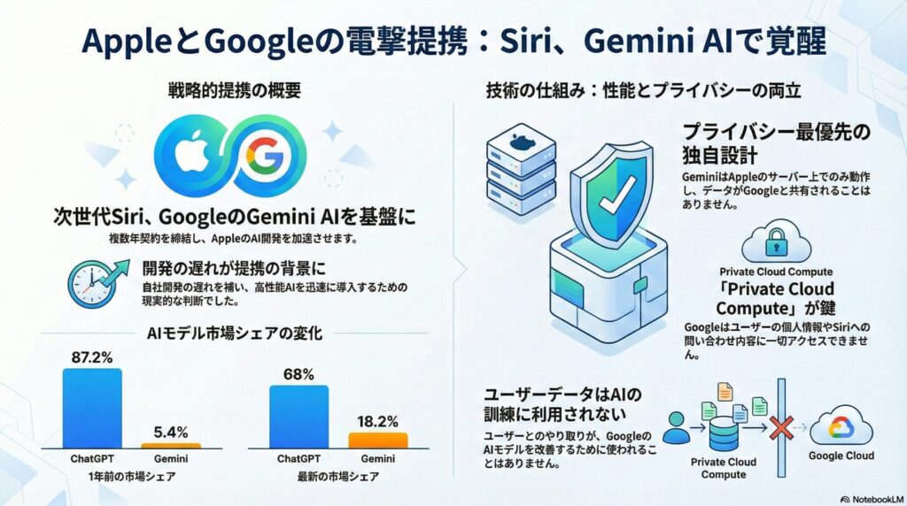 しかし、ここがAppleの上手いところです。今回の提携では、「Googleのサーバーではなく、Appleのプライベートクラウド(PCC)上でGeminiを動かす」というアーキテクチャが採用されています。